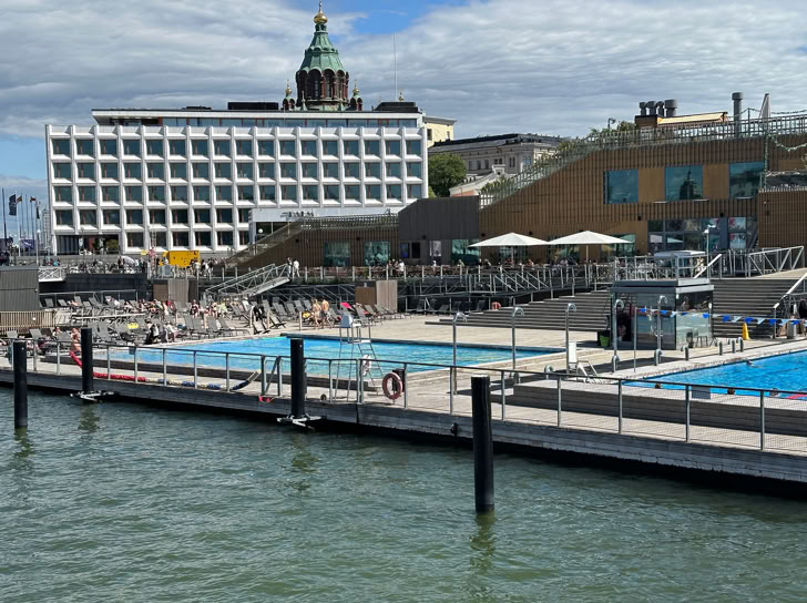 We slept late, again, and caught the ferry from the pier at Kauppatori that took us to the island of Suomenlinna. The journey took about fifteen minutes. On the way, we saw the outdoor sea pool popular with swimmers and the Viking Ship dock. On the island, we walked through the more modern buildings to the 19th century fortifications on the far shore line. We had nice views of cruise ships and the sea and surrounding islands. The highly recommended church, although still in use, was not open for visits. Our walk back to the ferry terminal completed our stroll of about three miles. All our tour books said this island, a UNESCO site, is a “not miss” sight in Helsinki, but it did not particularly impress us. We still enjoyed being out in the sunshine and fresh air.
